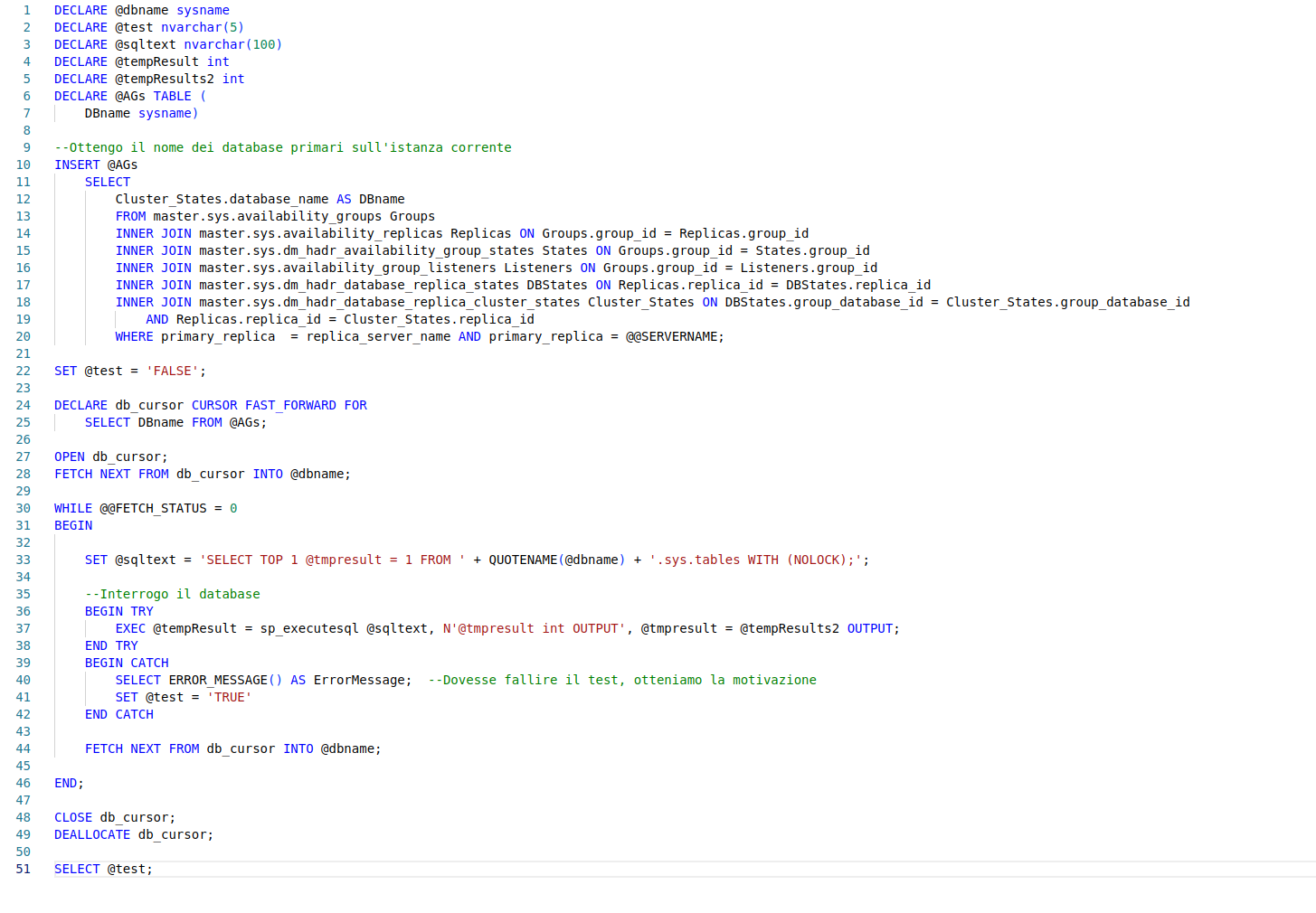 Per questo, è stato messo a punto un sistema di alert proattivo, in modo da rilevare il problema mentre accade, anche se non è visibile nei classici cruscotti degli AG o se i log non mostrano anomalie evidenti. L’obiettivo dell’alert è tanto banale quanto efficace: verificare periodicamente che tutti i database primari siano effettivamente accessibili e leggibili. Questo permette di intercettare tempestivamente anche situazioni "anomale" ma formalmente consistenti, come nel nostro caso o in altre situazioni dove per qualche motivo il database non è aperto (ad esempio, perché portato offline da SQL Server per problemi di corruzione file o consistenza, non che quello sia molto piacevole).