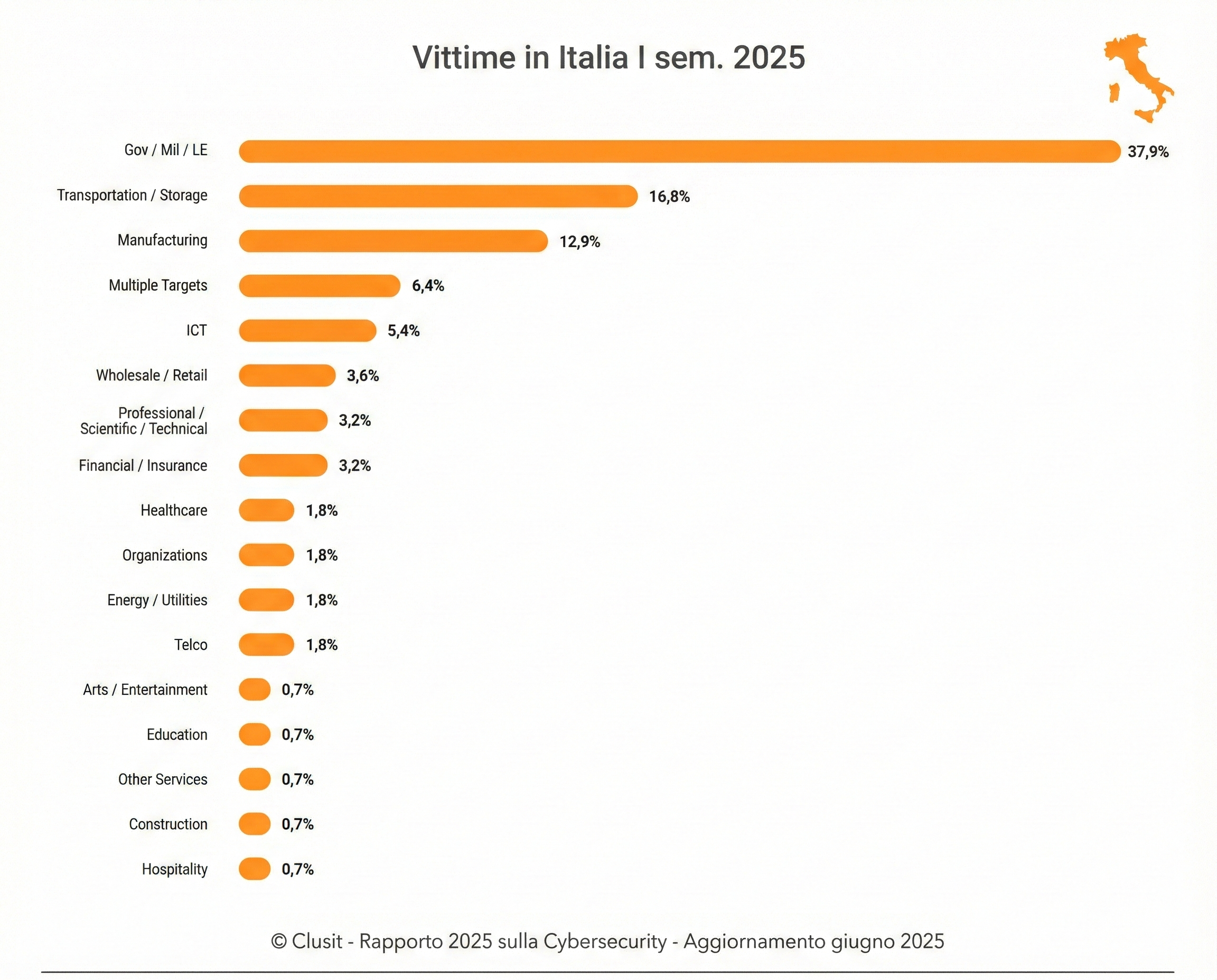 I dati del Rapporto Clusit 2025 evidenziano una situazione critica per l'Italia, definita la "maglia nera" della cybersecurity. Nel solo primo semestre del 2025 sono stati registrati 2.755 incidenti informatici documentati, in netto aumento rispetto al semestre precedente, rappresentando il 10,2% degli incidenti globali. Tra i settori più colpiti spiccano il comparto Governativo/Militare (37,9%), seguito da Trasporti e Logistica (16,8%) e Manifatturiero (12,9%).