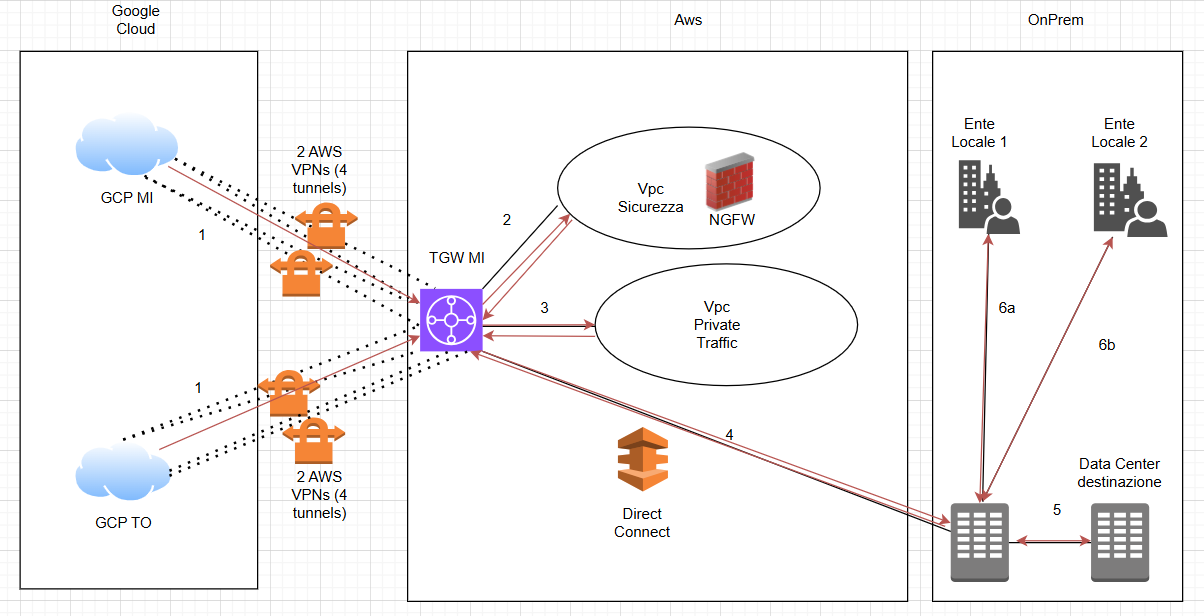 Raffiguriamo, di seguito, ad alto livello, l’infrastruttura del caso in esame in cui la numerazione considera il traffico da GCP (1) verso destinazioni finali DataCenter (5) , Ente locale 1(6a) e Ente locale 2 (6b).